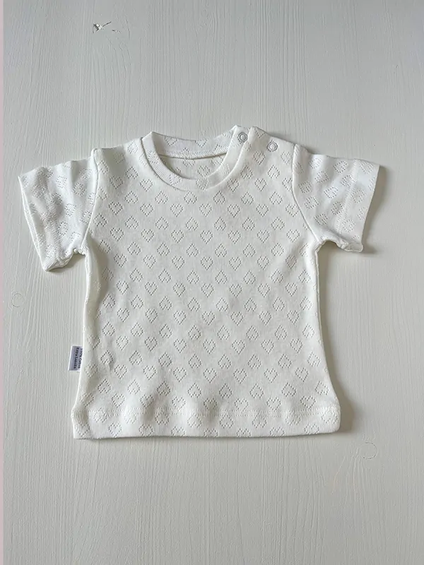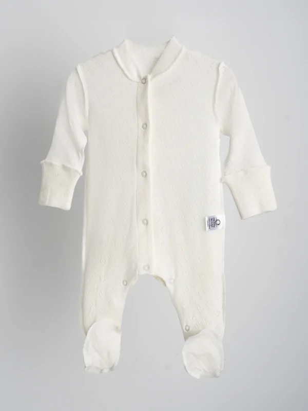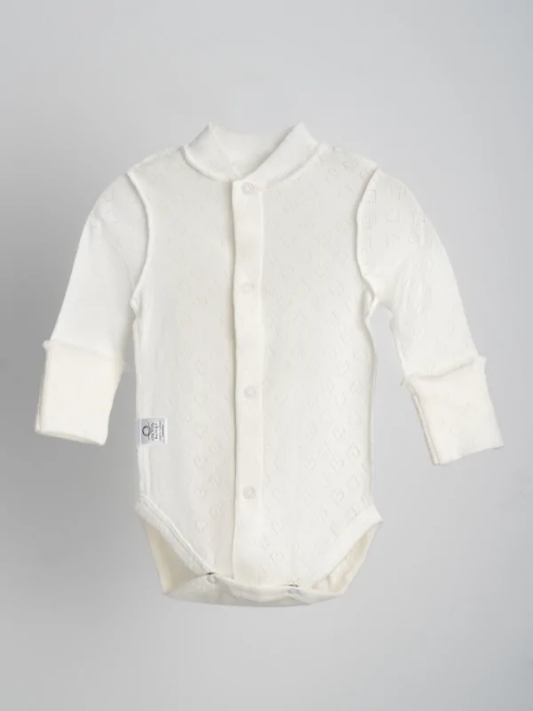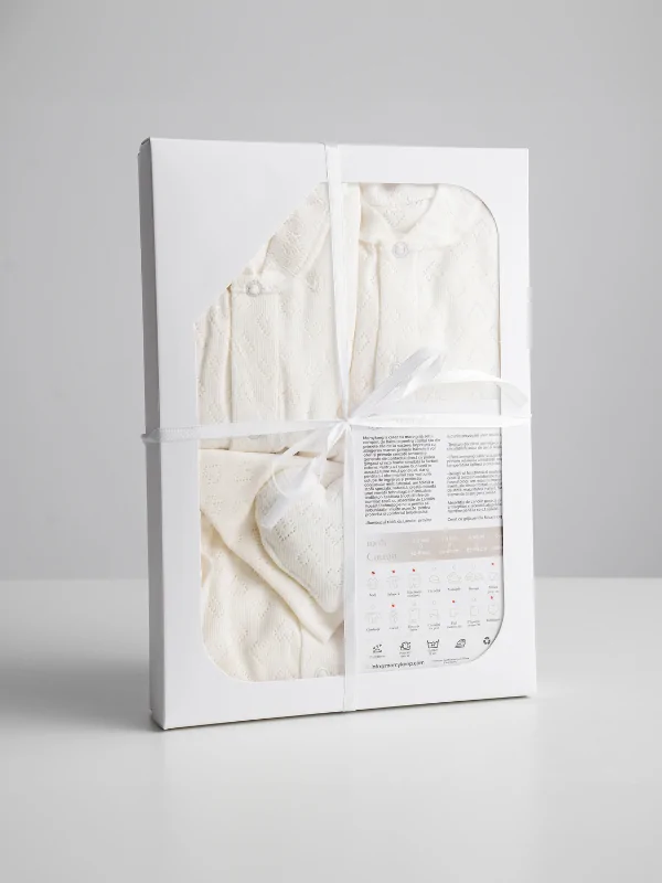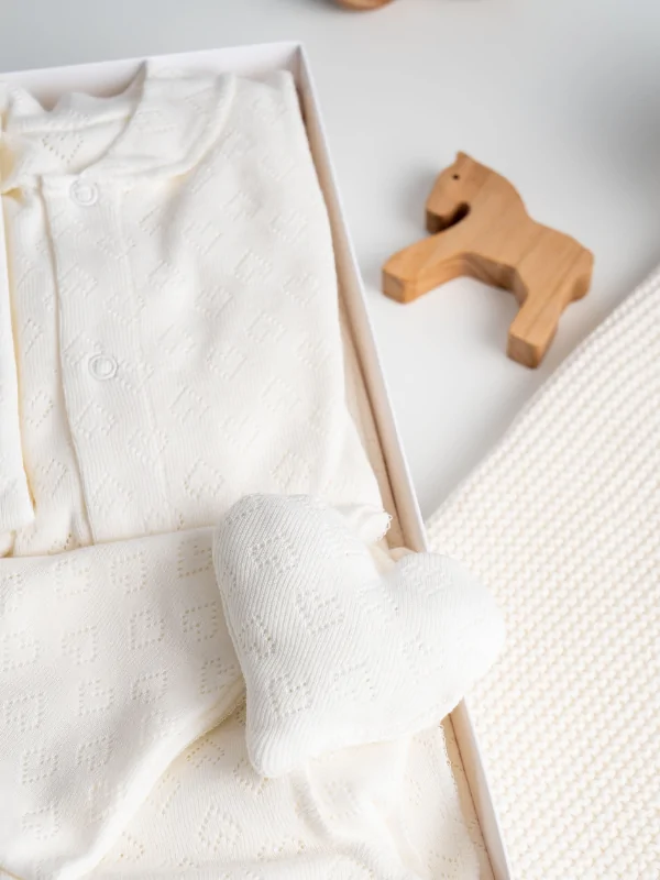 Cu mărimea potrivită (50-62 cm), aceste hăinuțe îmbrățișează cu grijă micul trup în primele două luni de la naștere. Toate hăinuțele și accesoriile textile sunt realizate din bumbac organic, impregnat cu lanolină, având un model delicat cu inimioare.