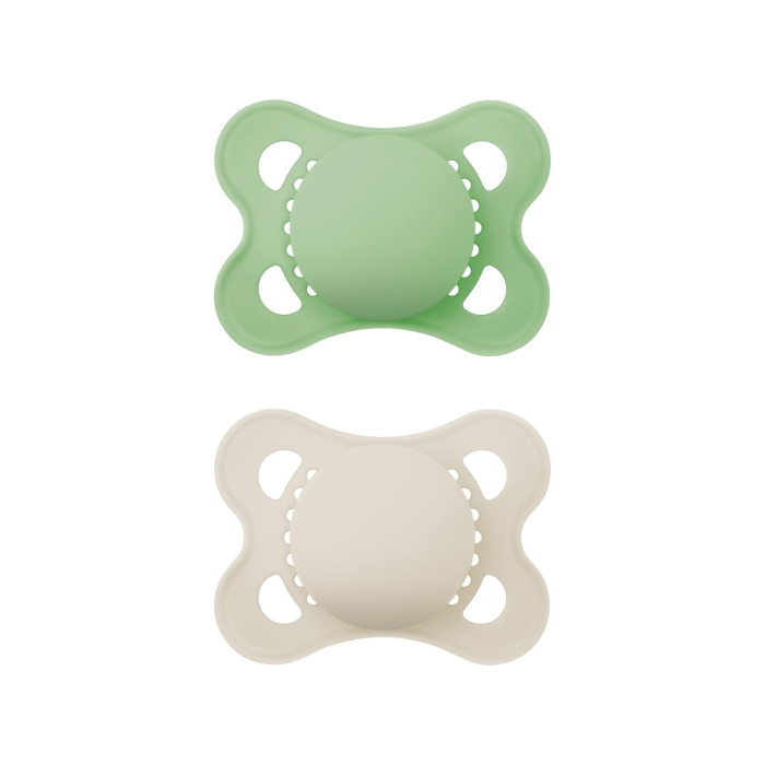 Suzetă prietenoasă cu dinții, fabricată din materiale sustenabile și organice regenerabile, tetină din silicon MAM SkinSoft cu cutie pentru suzetă, 0-6 luni, verde/bej.