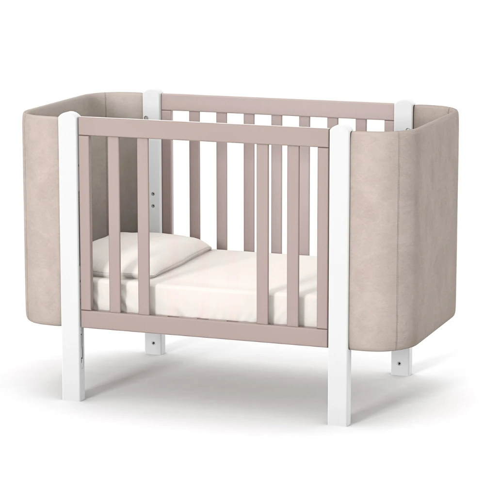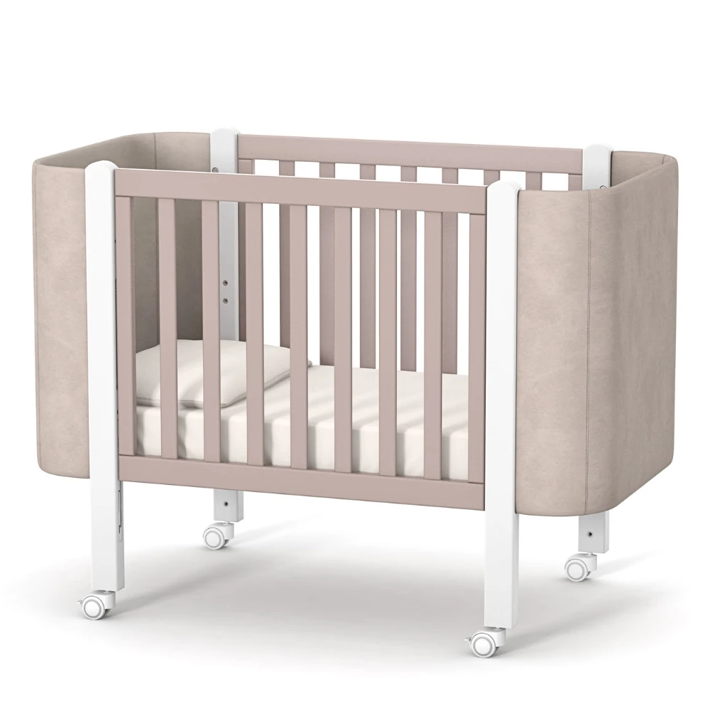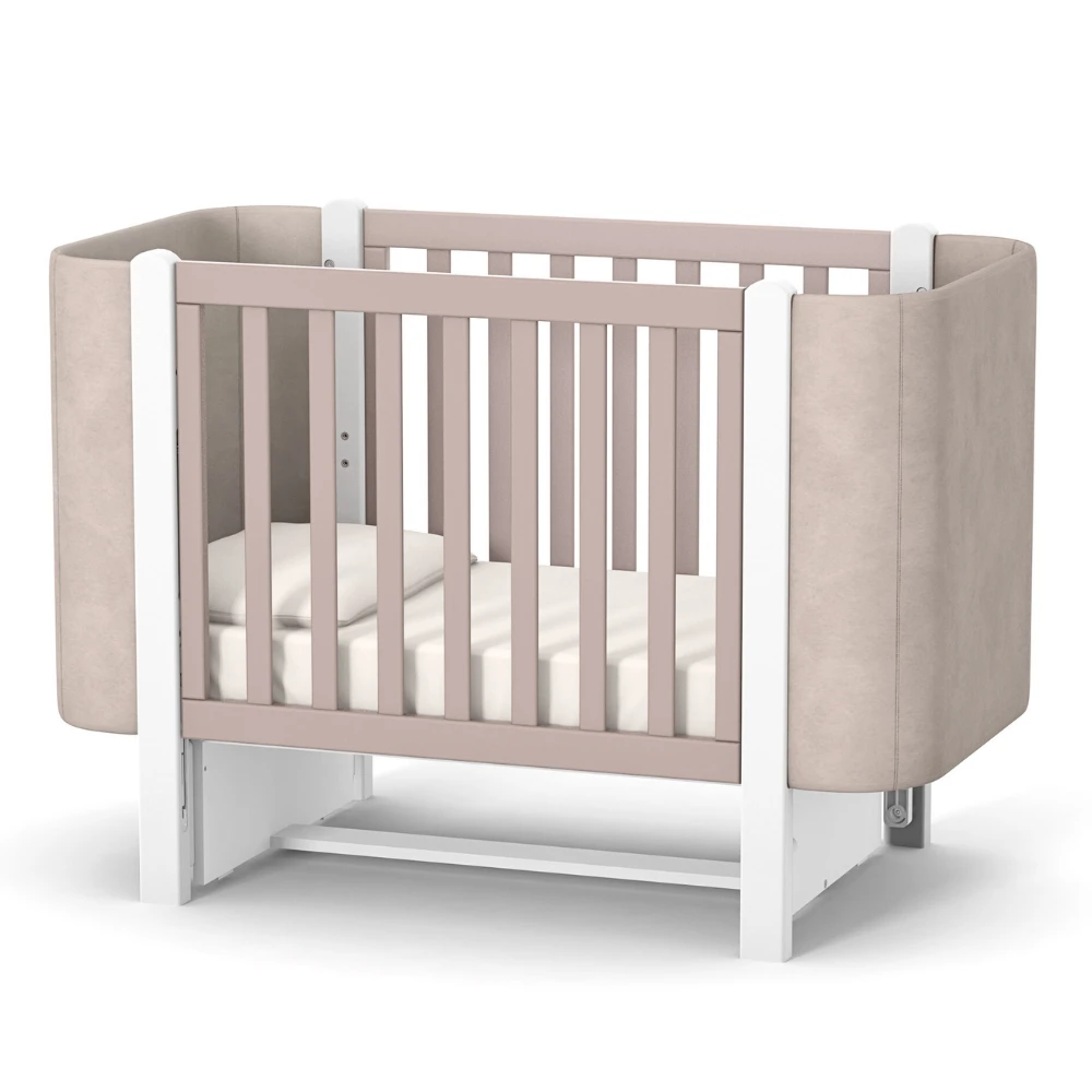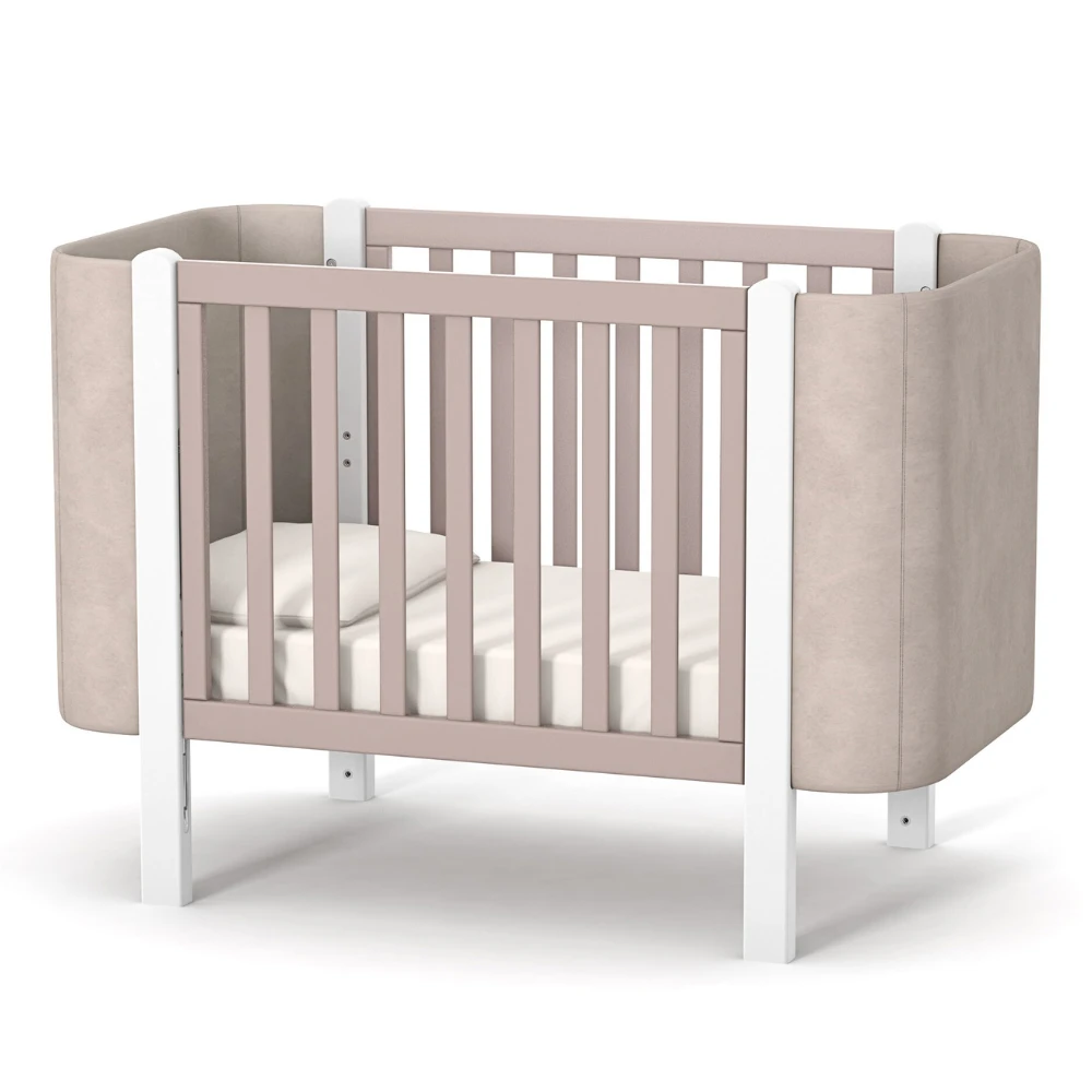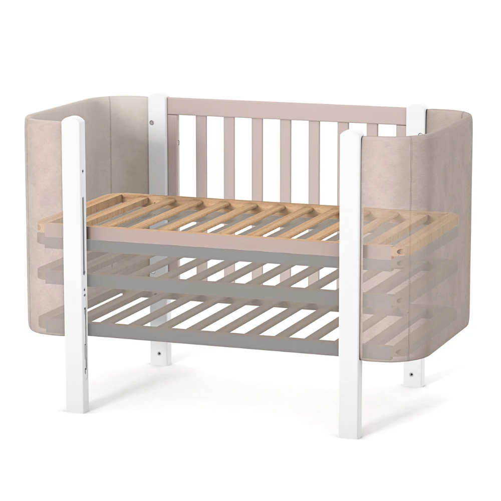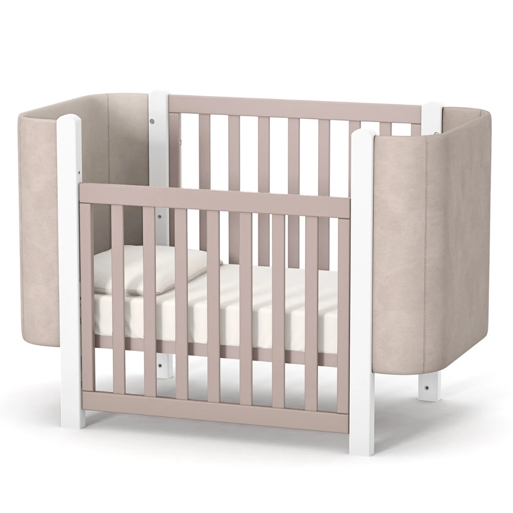 - husele exterioare detașabile ale pereților laterali ai pătuțului sunt confecționate din velur moale , similar tactil cu pielea întoarsă - confortabil și plăcut la atingere; materialul este hipoalergenic, rezistent la uzură, cu un grad ridicat de rezistență la umiditate, compoziție - 100% PES; umplutură - spumă elastică; husa este finisată cu o cusătură lată, rezistentă, pe două rânduri; caracteristici de îngrijire: curățare chimică;