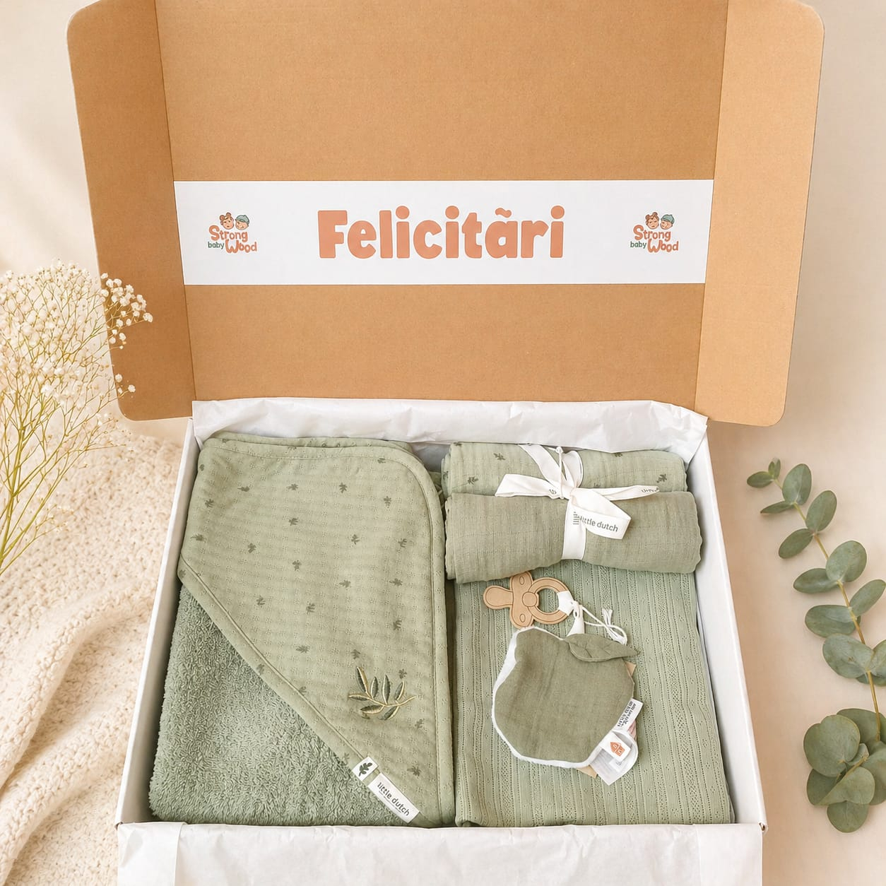 Set cadou premium pentru nou-născut, în nuanțe elegante de verde salvie, realizat din materiale moi și delicate cu pielea sensibilă a bebelușului. Un cadou practic, elegant și gata de oferit pentru baby shower, maternitate sau primele vizite la bebe 🤍