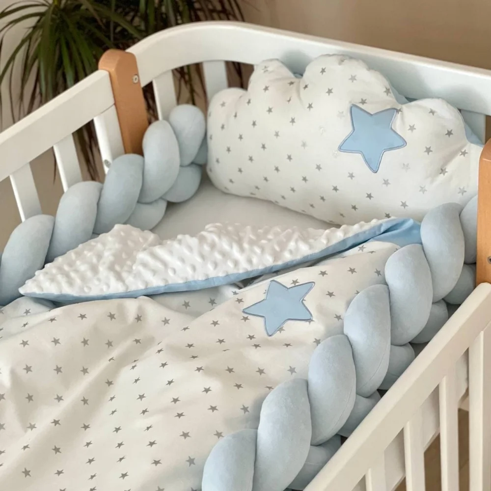 • Două împletituri laterale din velur de 120×17 cm, umplute cu holofibră, pentru a asigura siguranța bebelușului în pătuț.