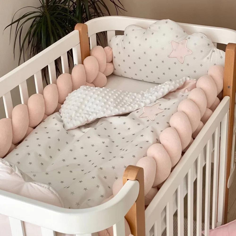 • Două împletituri laterale din velur de 120×17 cm, umplute cu holofibră, pentru a asigura siguranța bebelușului în pătuț.