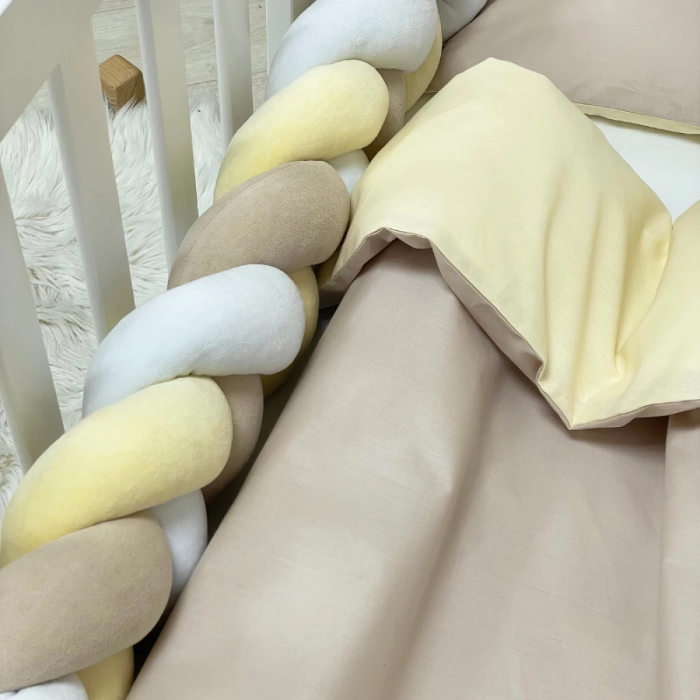 Husă de pilotă, față de pernă, cearșaf și huse laterale detașabile cu fermoar, confecționate din țesătură naturală de bumbac, cearșaf cu elastic. Husele detașabile au bucle și legături speciale pentru fixare sigură la pătuț. Prezența fermoarului pe husele laterale din bumbac permite spălarea separată a huselor și a umpluturii. Umplutura laterală este din fibră siliconată, amplasată în huse speciale de protecție nețesute. Pătura și perna sunt fabricate din microfibră - o țesătură „pufoasă” și delicată, plăcută la atingere. Pătura și umplutura pernei sunt hipoalergenice, ușoare, naturale, din fibră de bumbac Esotton soft. Greutate pătură 250 g. Greutate pernă 120 g.