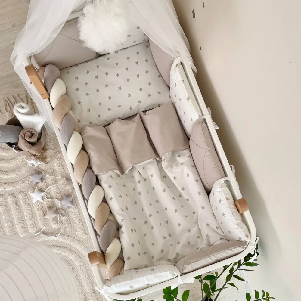 Set lenjerie patut bebe stelute bej compus din 7 piese din bumbac (pernute laterale, protectie impletita, plapumioara, plic, perna, fata de perna si cearceaf).