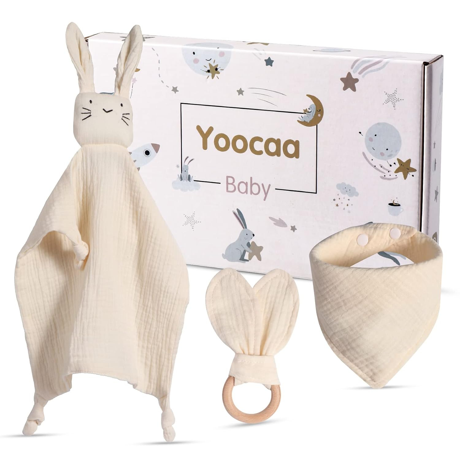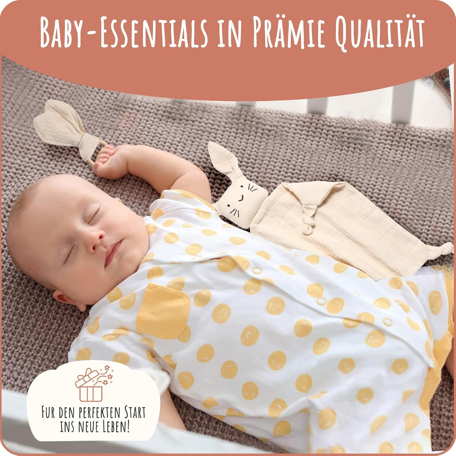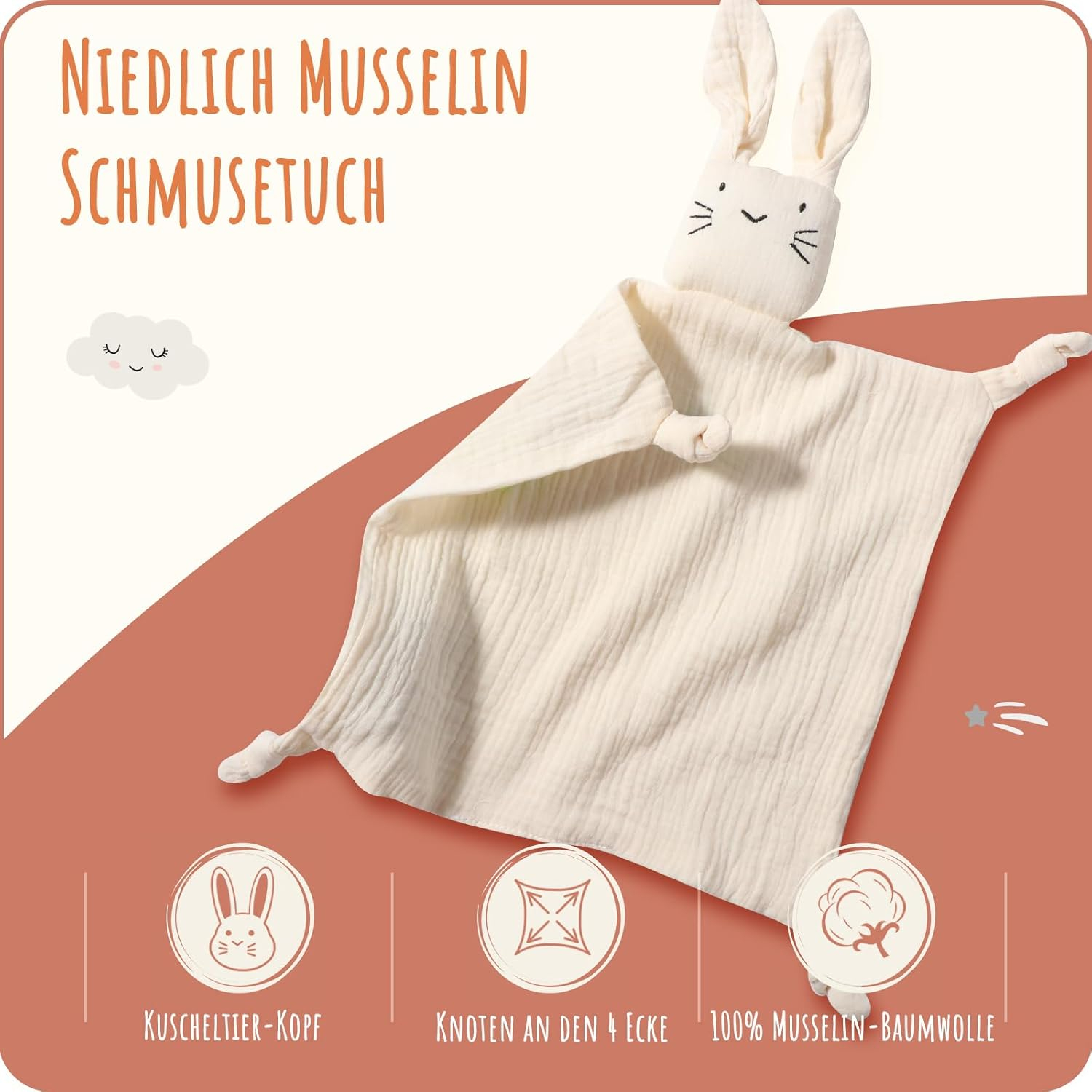 Factor de drăgălășenie: capetele înnodate ale cârpei pentru prindere, pătura pufoasă cu design de iepure și inelul de dentiție cuceresc inima bebelușului în cel mai scurt timp
