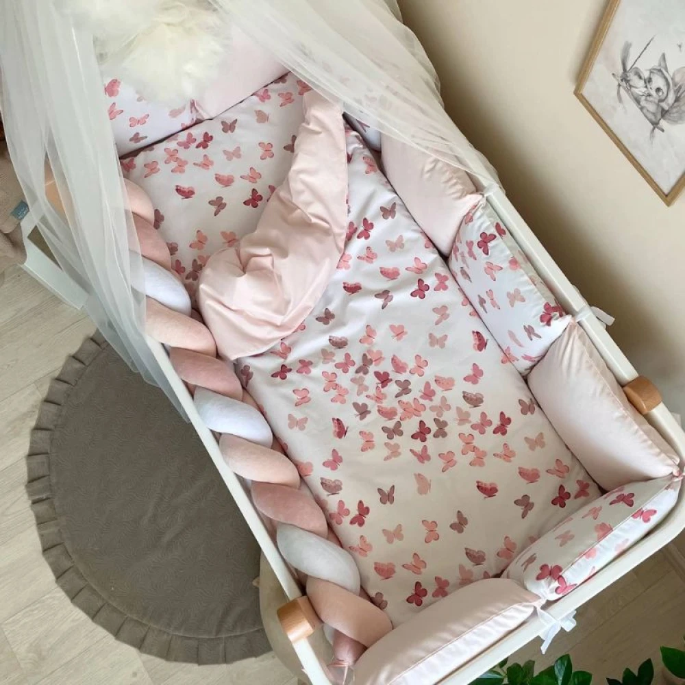 Set lenjerie fluturi roz pentru patut bebe compus din 7 piese din bumbac (pernute laterale,protectie laterala impletita, plapumioara, plic, perna, fata de perna si cearceaf).